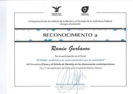Вклад Рамина Гурбанова в работу данного международного мероприятия был высоко оценен Верховным судом и Федеральным советом юстиции Мексики, ему была вручена благодарственная грамота.