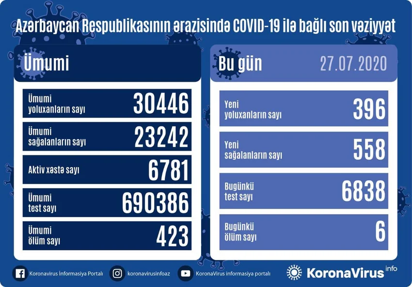 В Азербайджане зарегистрировано 396 новых случаев заражения коронавирусной инфекцией, 558 человек излечились и были выписаны домой.