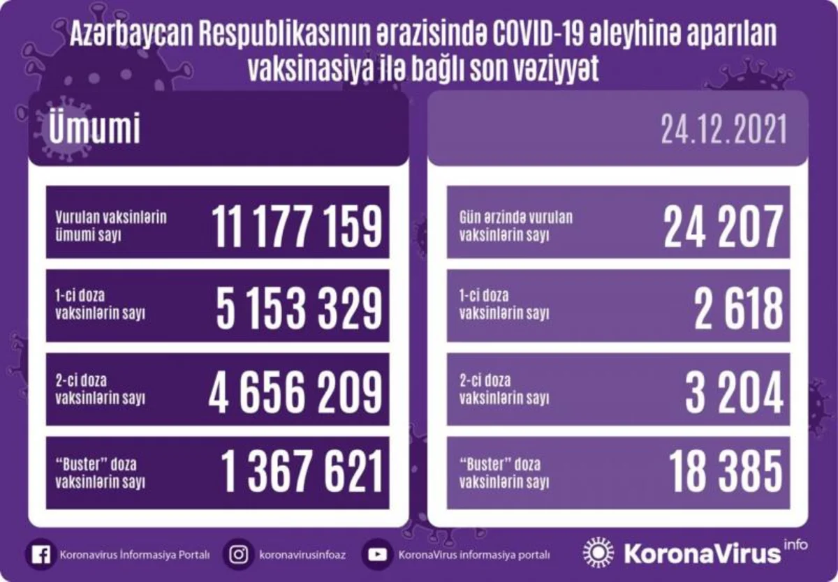 Общее число вакцинаций в Азербайджане на сегодняшний день составляет 11 177 159, из них первую дозу вакцины получили 5 153 329, две дозы - 4 656 209, бустерную дозу - 1 367 621 человек.