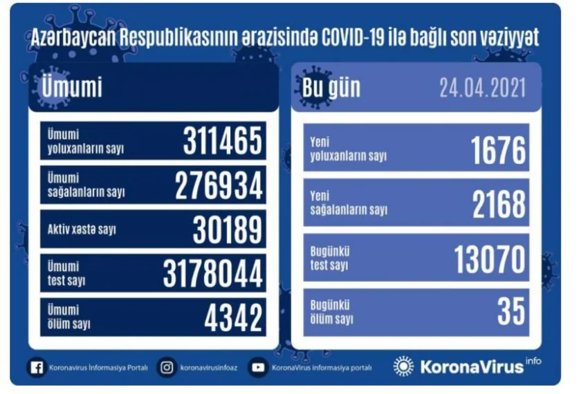 Son sutka ərzində yeni yoluxma hallarının müəyyənləşdirilməsi ilə əlaqədar 13 070, bu günə qədər isə ümumilikdə 3 178 044 test icra olunub.