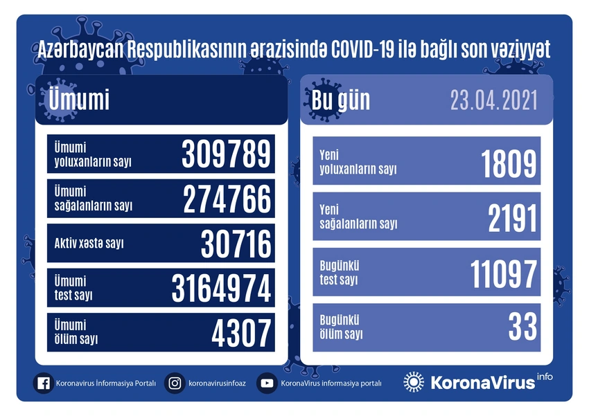 Son sutka ərzində yeni yoluxma hallarının müəyyənləşdirilməsi ilə əlaqədar 11 097, bu günə qədər isə ümumilikdə 3 164 974 test icra olunub.