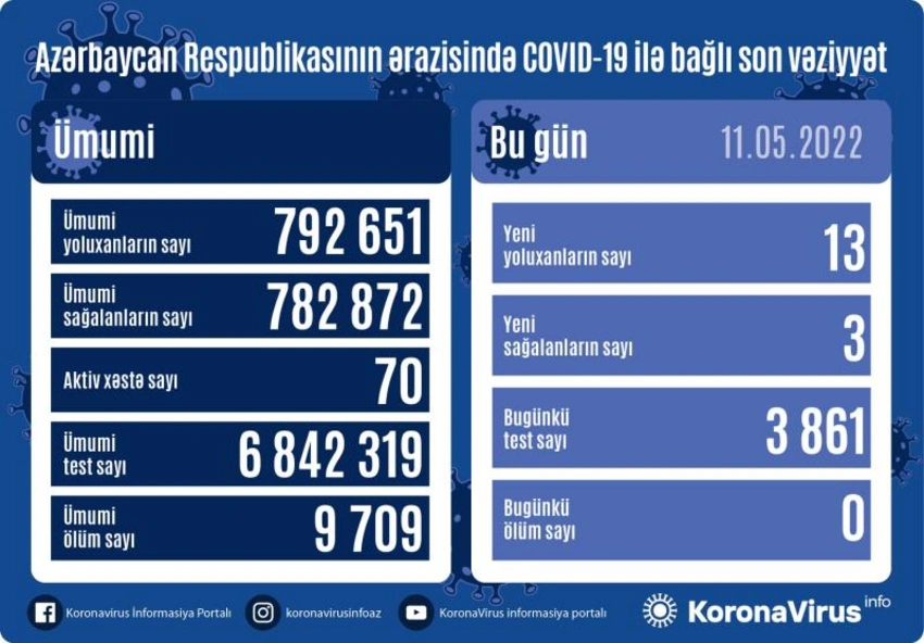 Son sutka ərzində yeni yoluxma hallarının müəyyənləşdirilməsi ilə əlaqədar 3 861, bu günə qədər isə ümumilikdə 6 842 319 test icra olunub.