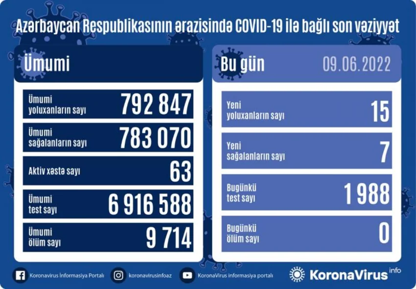Son sutka ərzində yeni yoluxma hallarının müəyyənləşdirilməsi ilə əlaqədar 1 988, bu günə qədər isə ümumilikdə 6 916 588 test icra olunub.