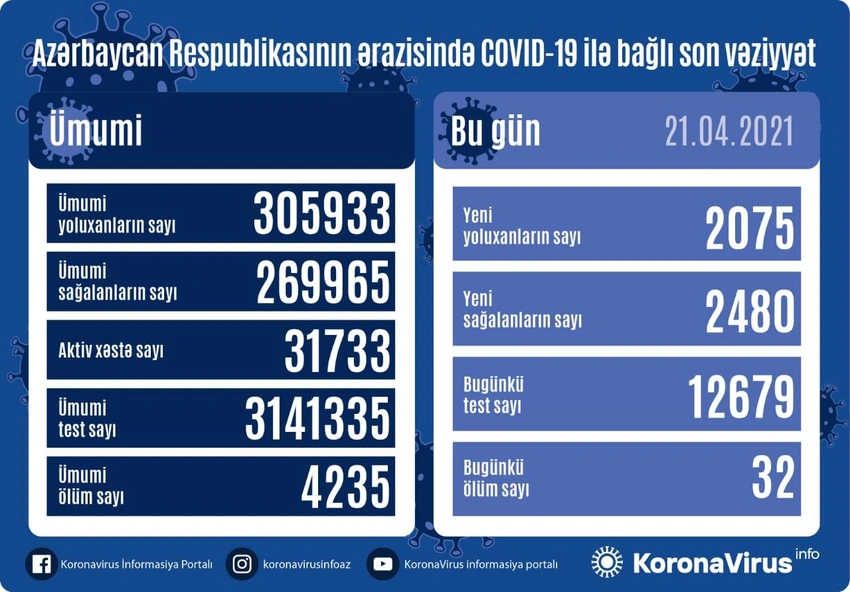 Son sutka ərzində yeni yoluxma hallarının müəyyənləşdirilməsi ilə əlaqədar 12 679, bu günə qədər isə ümumilikdə 3 141 335 test icra olunub.