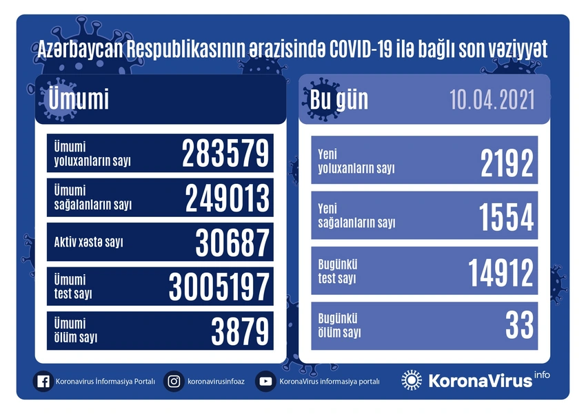 Son sutka ərzində yeni yoluxma hallarının müəyyənləşdirilməsi ilə əlaqədar 14 912, bu günə qədər isə ümumilikdə 3 005 197 test icra olunub.