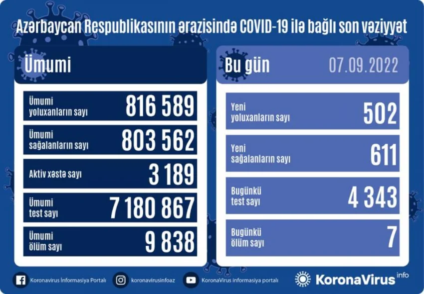 Son sutkada Azərbaycanda 502 nəfər koronavirusa yoluxub, 7 nəfər ölüb