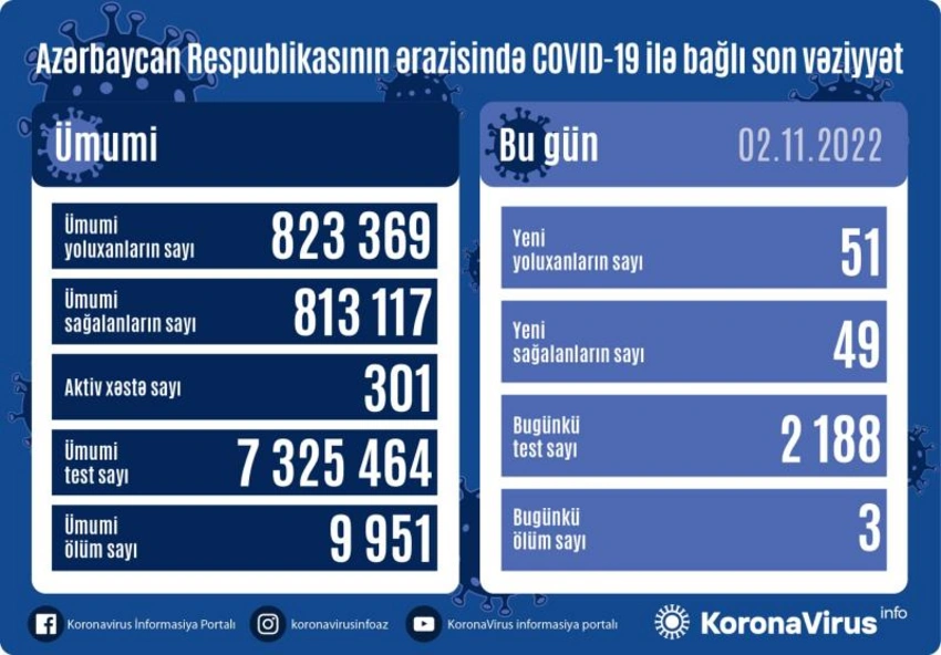 Azərbaycanda koronavirus (COVID-19) infeksiyasına son sutkada 51 yeni yoluxma faktı qeydə alınıb, 49 nəfər müalicə olunaraq sağalıb.
