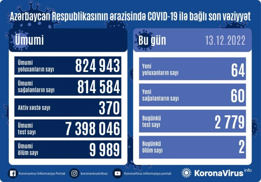 Son sutka ərzində yeni yoluxma hallarının müəyyənləşdirilməsi ilə əlaqədar 2 779, bu günə qədər isə ümumilikdə 7 398 046 test icra olunub.