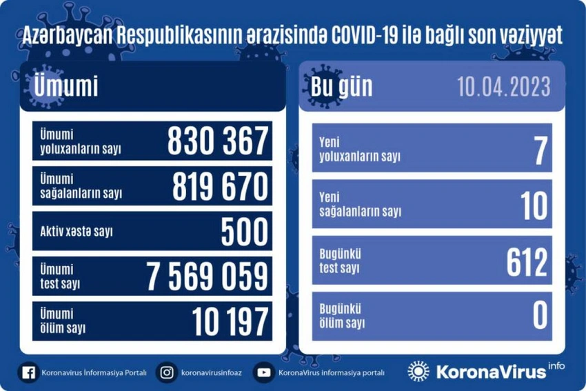 Məlumata görə, son sutka ərzində yeni yoluxma hallarının müəyyənləşdirilməsi ilə əlaqədar 612, bu günə qədər isə ümumilikdə 7 569 059 test icra olunub.