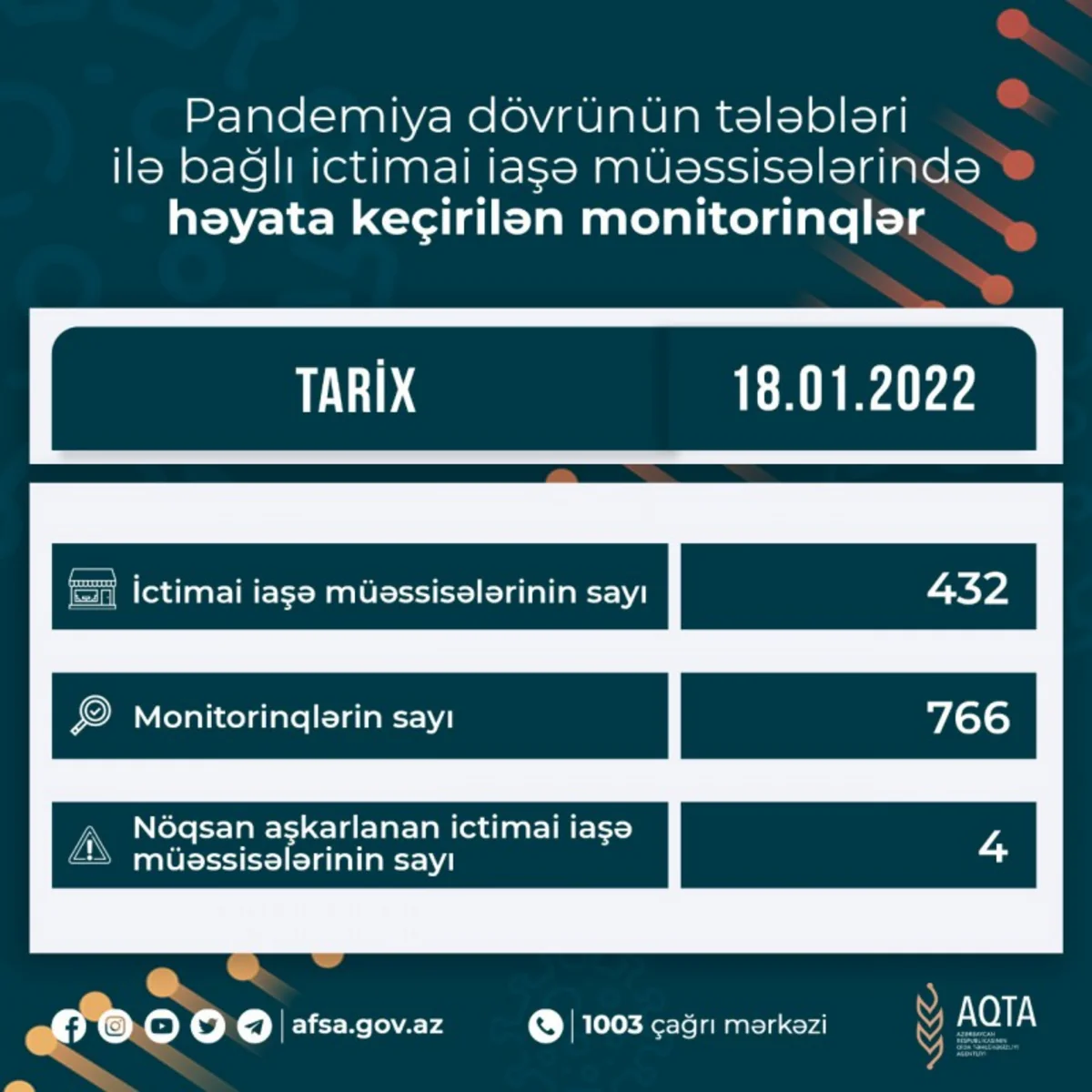 Azərbaycan Respublikasının Qida Təhlükəsizliyi Agentliyi (AQTA) nəzarət tədbirləri çərçivəsində 2022-ci il yanvarın 18-də ölkə üzrə 432 ictimai iaşə obyektində 766 monitorinq keçirib.