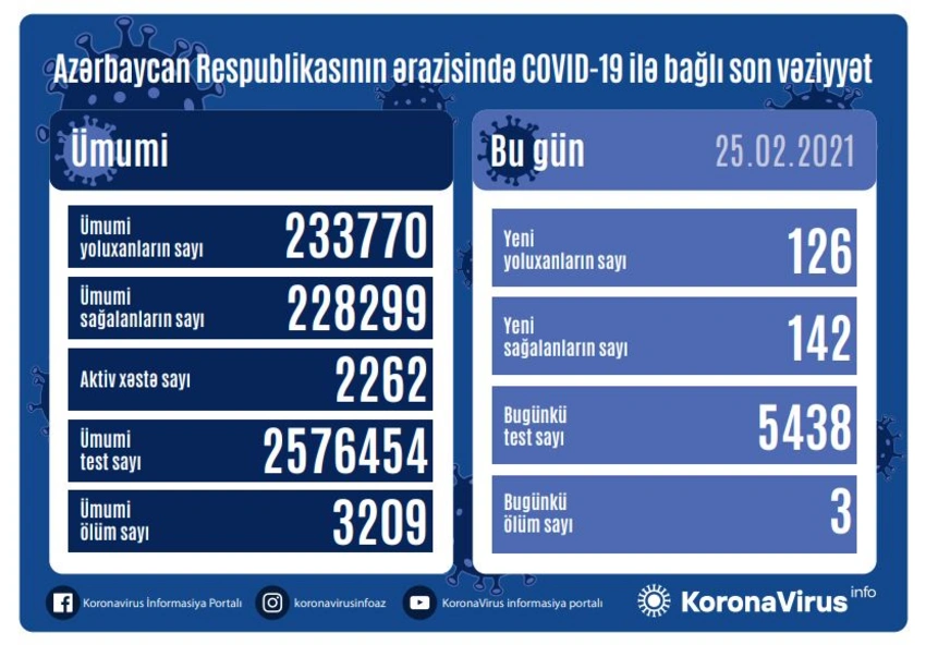 Son sutka ərzində yeni yoluxma hallarının müəyyənləşdirilməsi ilə əlaqədar 5 438, bu günə qədər isə ümumilikdə 2 576 545 test icra olunub.