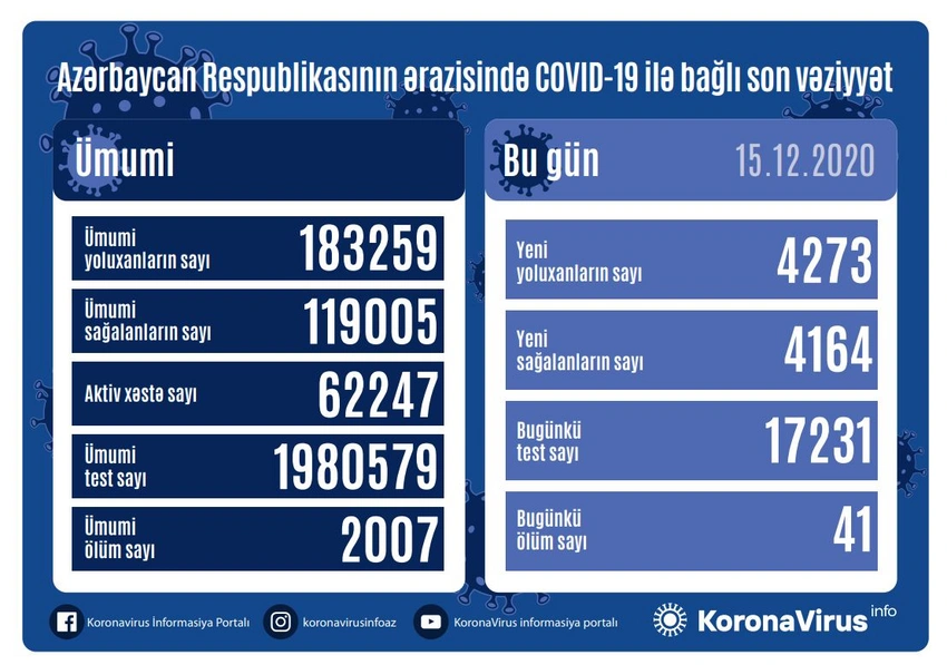 Azərbaycanda 4 273 yeni yoluxma faktı qeydə alınıb, 41 nəfər vəfat edib