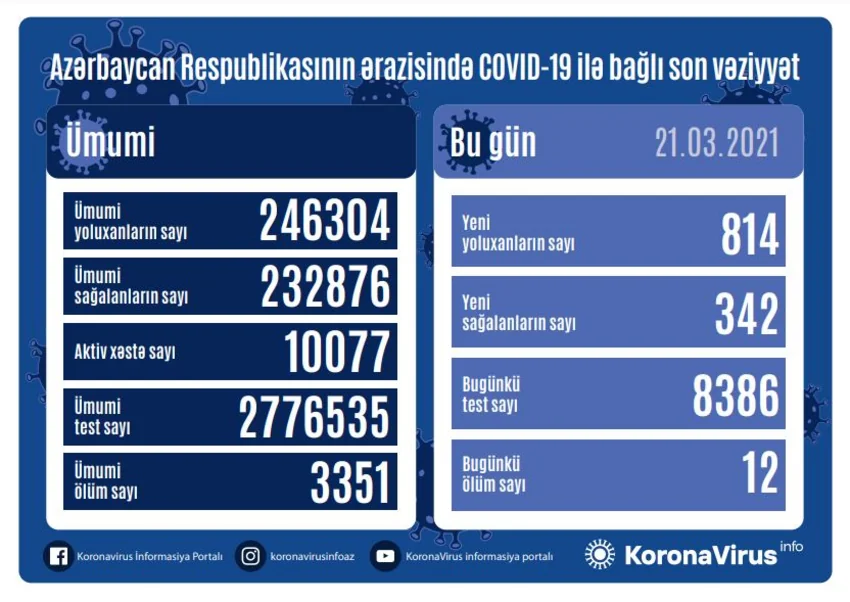 Azərbaycanda indiyədək ümumilikdə 246 304 nəfər koronavirus infeksiyasına yoluxub. Onlardan 232 876 nəfər müalicə olunaraq sağalıb, 3 351 nəfər vəfat edib, aktiv xəstə sayı 10 077 nəfərdir.