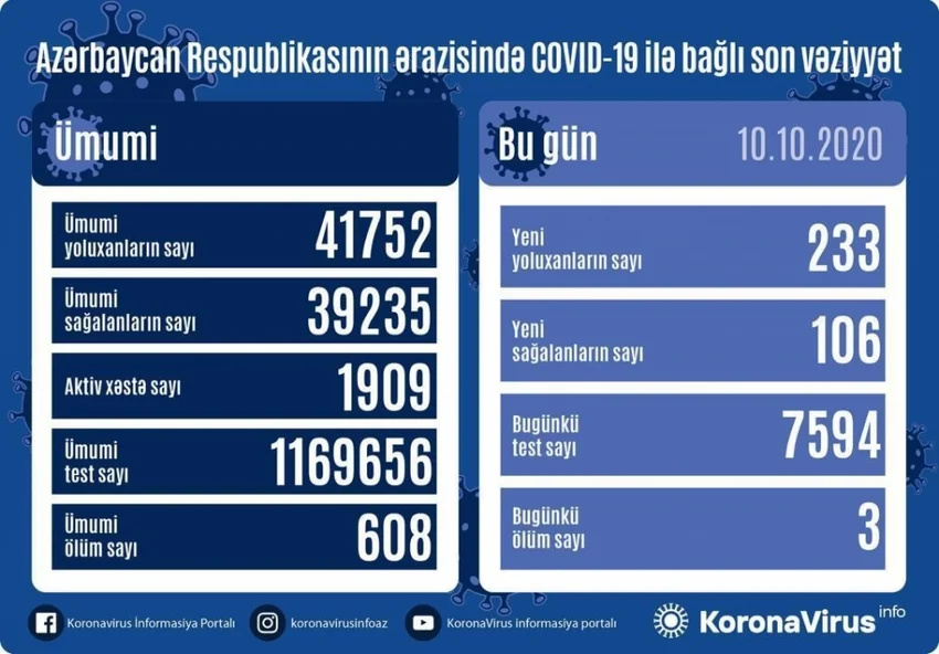 Hazırkı dövrədək ölkəmizdə 41 min 752 nəfərin koronavirus infeksiyasına yoluxması faktı müəyyən edilib. Onlardan 39 min 235 nəfər müalicə olunaraq sağalıb, 608 nəfər vəfat edib. Aktiv xəstə sayı 1 909 nəfərdir.