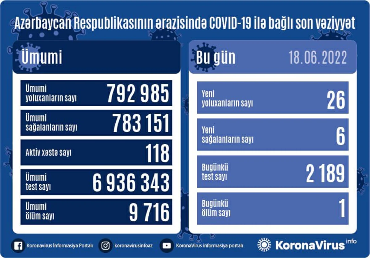 Azərbaycanda koronavirus (COVID-19) infeksiyasına 26 yeni yoluxma faktı qeydə alınıb, 6 nəfər müalicə olunaraq sağalıb.
