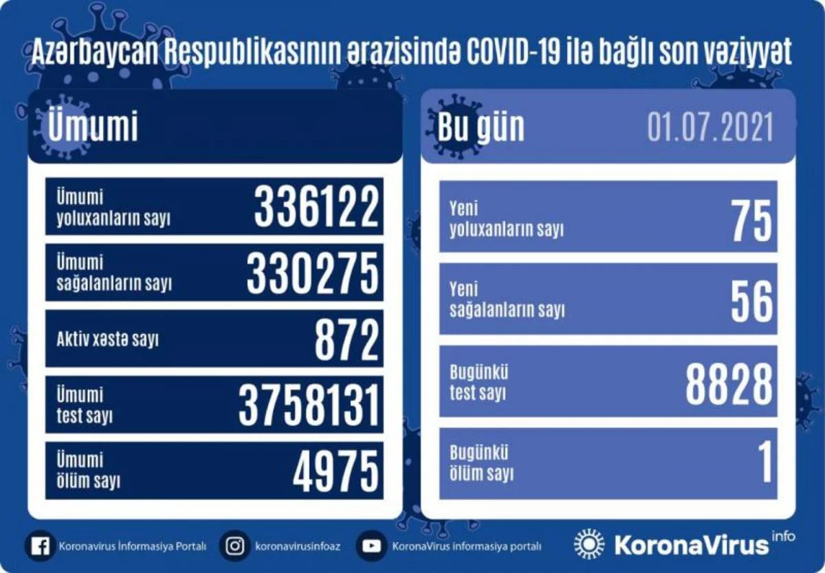 Azərbaycan Respublikasında koronavirus (COVID-19) infeksiyasına 75 yeni yoluxma faktı qeydə alınıb, 56 nəfər müalicə olunaraq sağalıb.