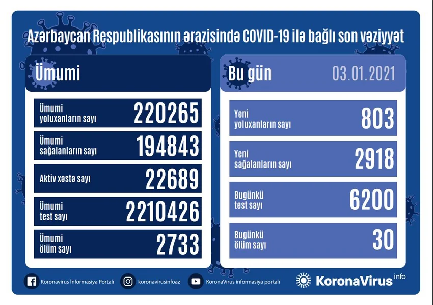 Azərbaycanda son sutkada koronavirus infeksiyasına 803 yeni yoluxma faktı qeydə alınıb, 2 918 nəfər müalicə olunaraq sağalıb.