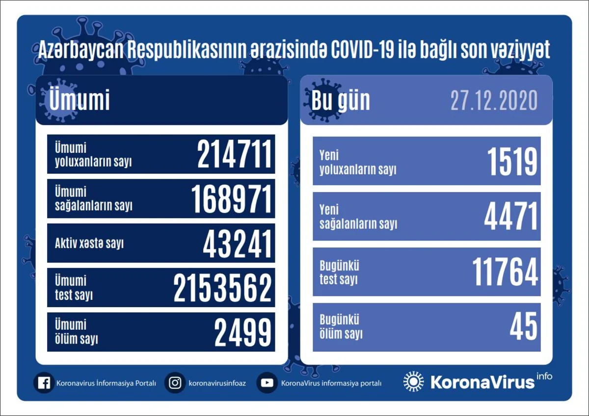 Azərbaycanda koronavirus infeksiyasına 1 519 yeni yoluxma faktı qeydə alınıb, 4 471 nəfər müalicə olunaraq sağalıb və evə buraxılıb.
