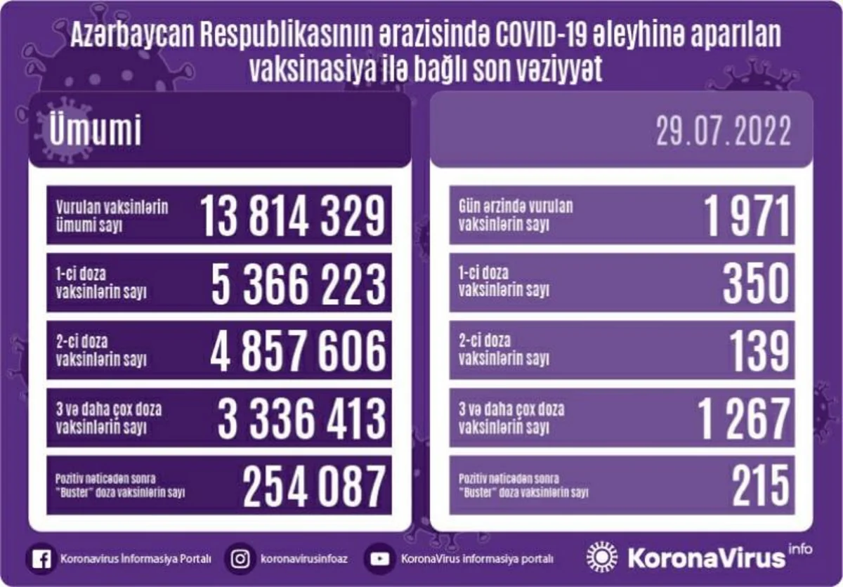 Qeyd edək ki, Azərbaycanda bu günə qədər vurulan vaksinlərin ümumi sayı 13 814 329 təşkil edir.