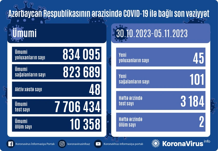 Məlumata görə, son həftə ərzində yeni yoluxma hallarının müəyyənləşdirilməsi ilə əlaqədar 3 184 , bu günə qədər isə ümumilikdə 7 706 434 test icra olunub.
