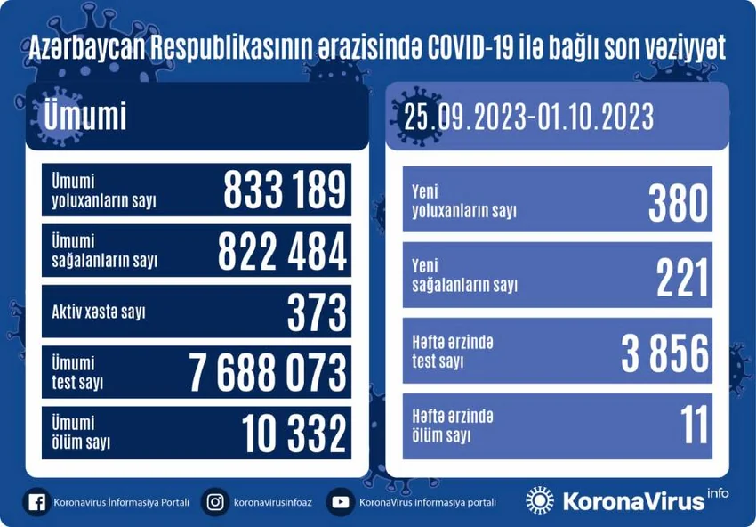Məlumata görə, son həftə ərzində yeni yoluxma hallarının müəyyənləşdirilməsi ilə əlaqədar 3 856, bu günə qədər isə ümumilikdə 7 688 073 test icra olunub.