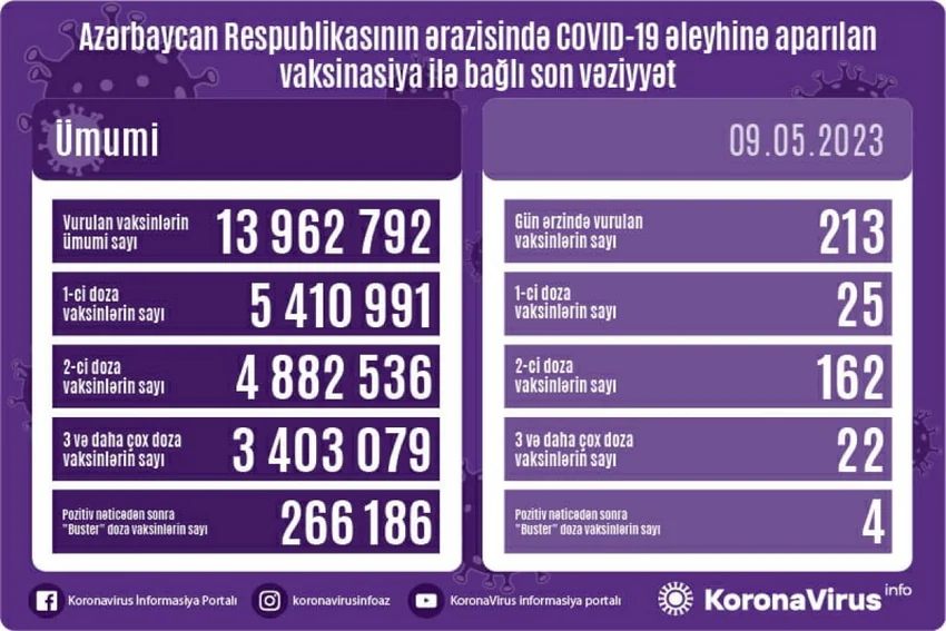 Bundan başqa son sutkada koronavirus (COVID-19) əleyhinə 213 vaksin vurulub. Vurulan vaksinlərin ümumi sayı 13 962 792 nəfər təşkil edir.