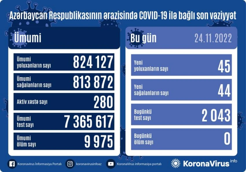 Son sutka ərzində yeni yoluxma hallarının müəyyənləşdirilməsi ilə əlaqədar 2 043, bu günə qədər isə ümumilikdə 7 365 617 test icra olunub.