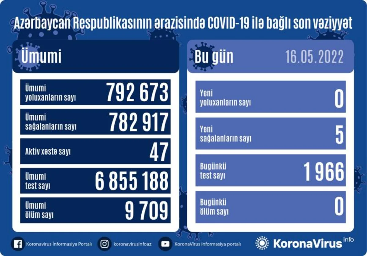 Azərbaycanda koronavirus (COVID-19) infeksiyasına yeni yoluxma faktı qeydə alınmayıb, 5 nəfər müalicə olunaraq sağalıb.
