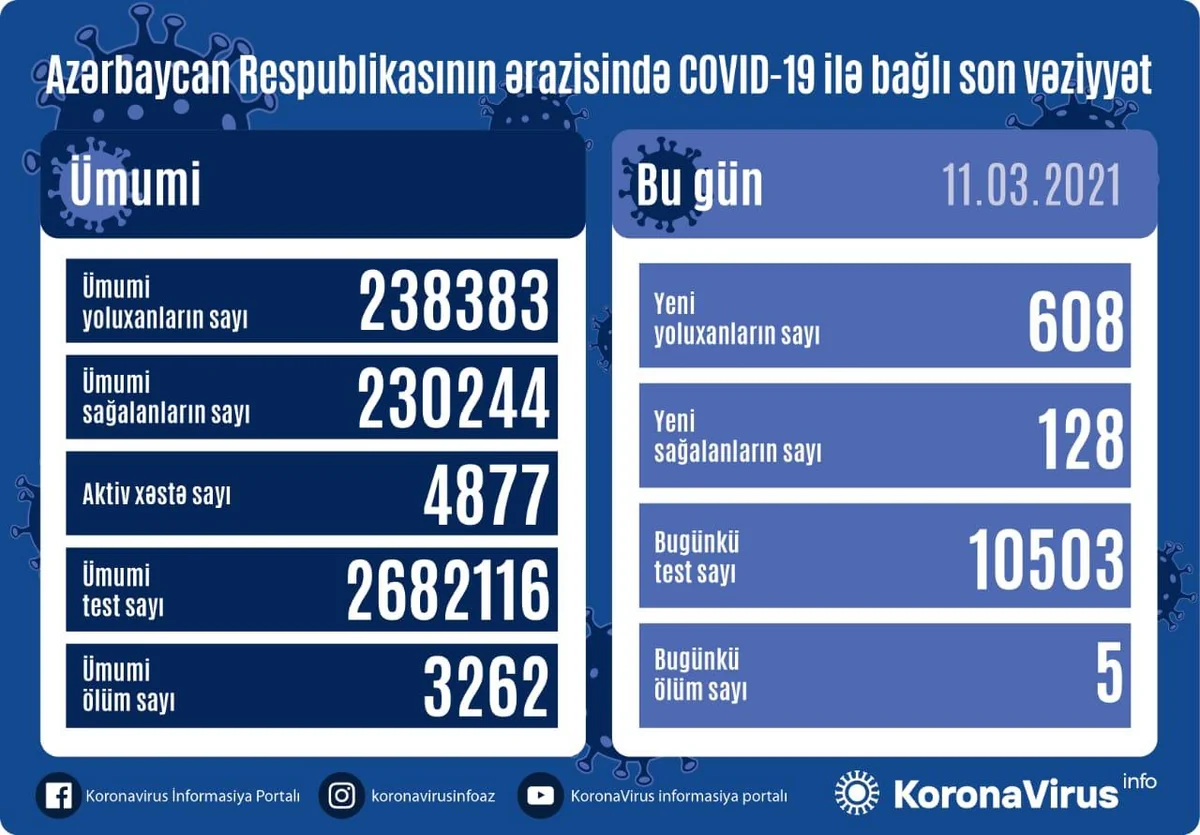 Azərbaycanda koronavirus (COVID-19) infeksiyasına 608 yeni yoluxma faktı qeydə alınıb, 128 nəfər sağalaraq evə buraxılıb.