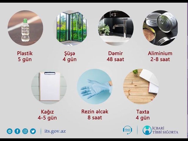 “Report” xəbər verir ki, görüntülərdə virusun plastik qablarda 5 gün, şüşədə 4 gün, dəmirdə 48 saat, alüminiumda 2-8 saat, kağızda 4-5 gün, rezin əlcəkdə 8 saat, taxtada 4 gün qaldığı əks olunub.