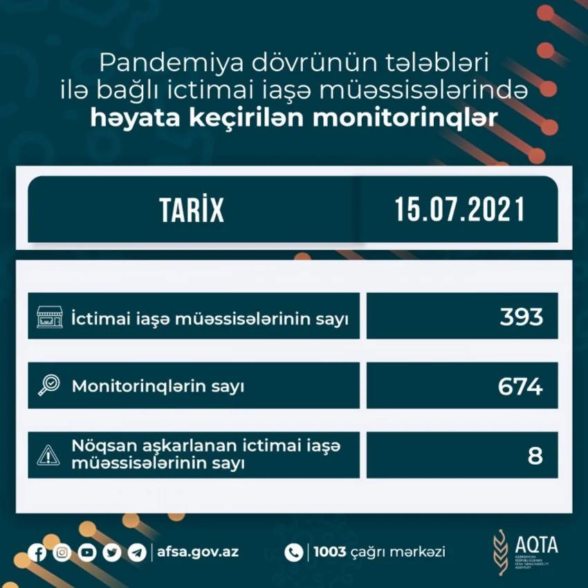 Qeyd edək ki, AQTA tərəfindən Bakıda, eləcə də regionlarda fəaliyyət göstərən ictimai iaşə obyektlərində monitorinqlərin miqyası genişləndirilib. Hazırda AQTA müfəttişləri tərəfindən respublika üzrə monitorinqlər davam etdirilir və qaydalara əməl etməyən sahibkarlıq subyektləri barədə ən sərt tədbirlər görüləcəkdir.