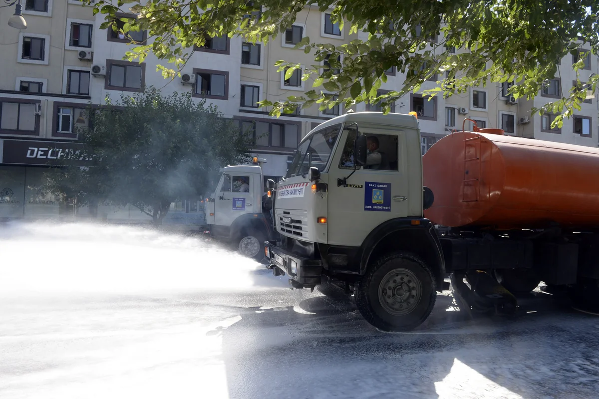 Bu gün Bakı Şəhər İcra Hakimiyyətinin strukturlarının tərəfindən paytaxtdakı əsas küçə və prospektlərdə, həmçinin qəsəbələrdə kommunal təsərrüfat xidmətlərinin 40 ədəd xüsusi texnikası və Daxili İşlər Nazirliyinin 20 ədəd xüsusi təyinatlı avtonəqliyyat vasitələrinin köməyi ilə artıq 9-cu dəfə xüsusi kimyəvi maddələrlə əlavə gücləndirilmiş dezinfeksiya işləri zamanı ümumilikdə 548 küçədə dezinfeksiya işləri görülüb.