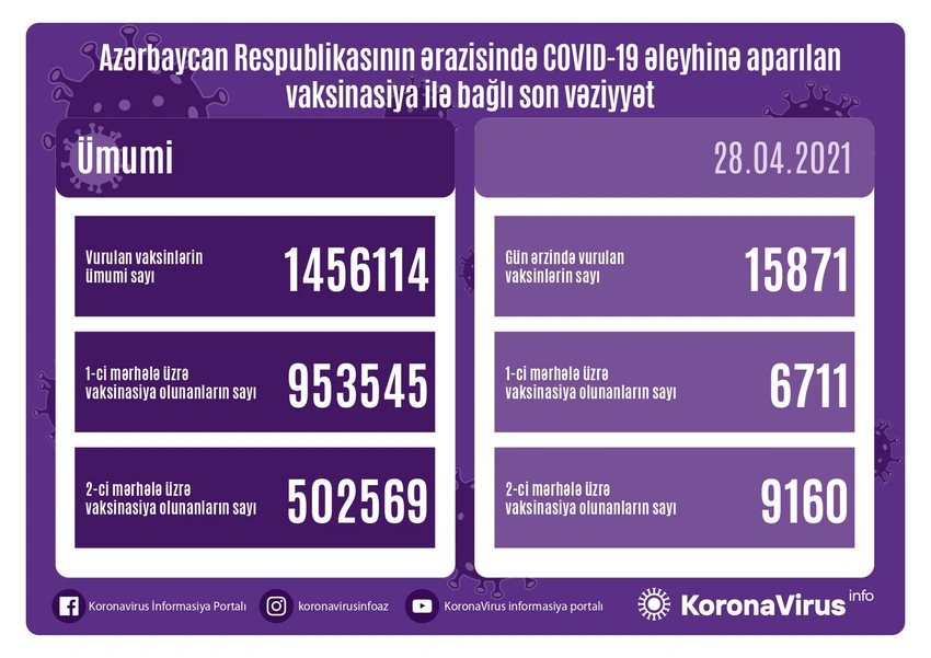 Ölkədə vurulan vaksinlərin ümumi sayı 1 456 114, birinci mərhələ üzrə vaksinasiya olunanların ümumi sayı 953 545, ikinci mərhələ üzrə vaksinasiya olunanların sayı isə 502 569 təşkil edir.