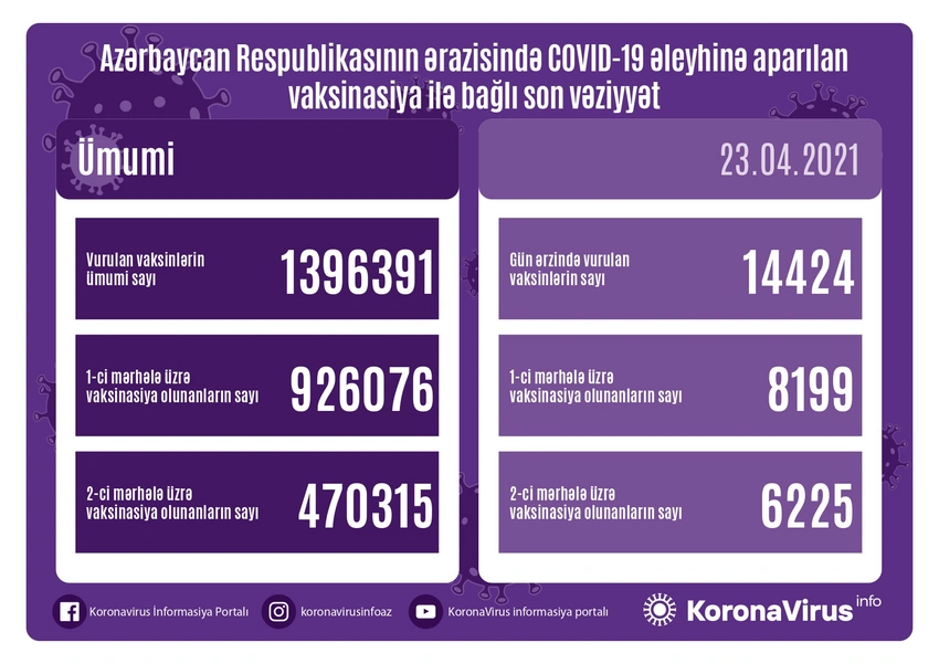 Ölkədə vurulan vaksinlərin ümumi sayı 1 396 391, birinci mərhələ üzrə vaksinasiya olunanların ümumi sayı 926 076, ikinci mərhələ üzrə vaksinasiya olunanların sayı isə 470 315 təşkil edir.