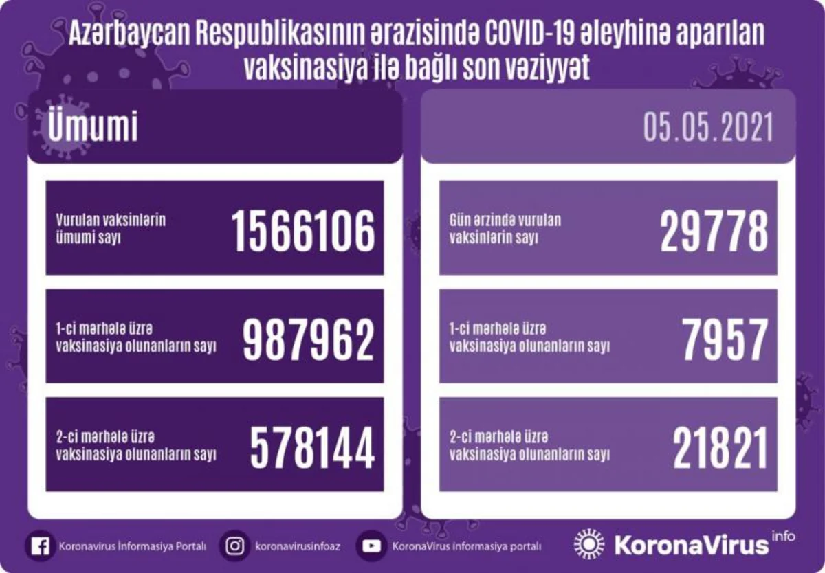 Azərbaycanda bu günə qədər vurulan vaksinlərin ümumi sayı 1566106, birinci mərhələ üzrə vaksinasiya olunanların ümumi sayı 987962, ikinci mərhələ üzrə vaksinasiya olunanların sayı isə 578144 təşkil edir.