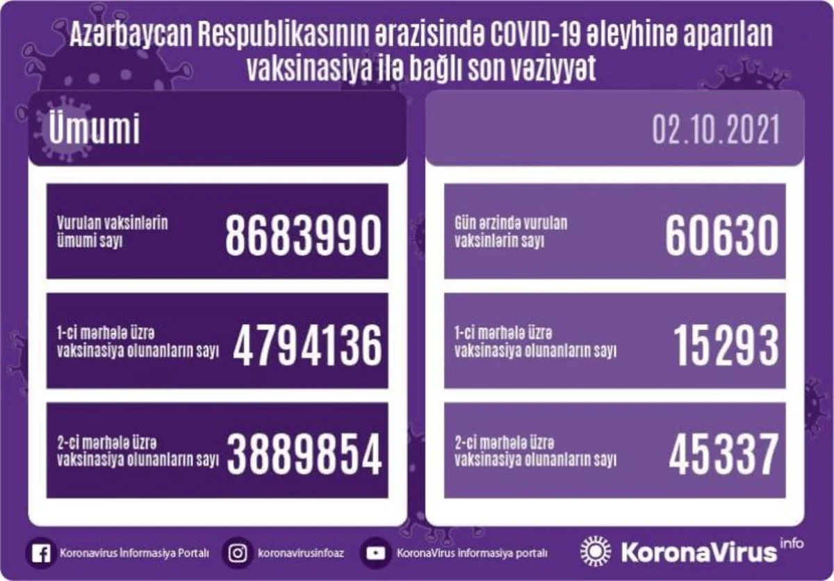 Azərbaycanda son sutkada koronavirus (COVID-19) əleyhinə 60 630 vaksin vurulub.