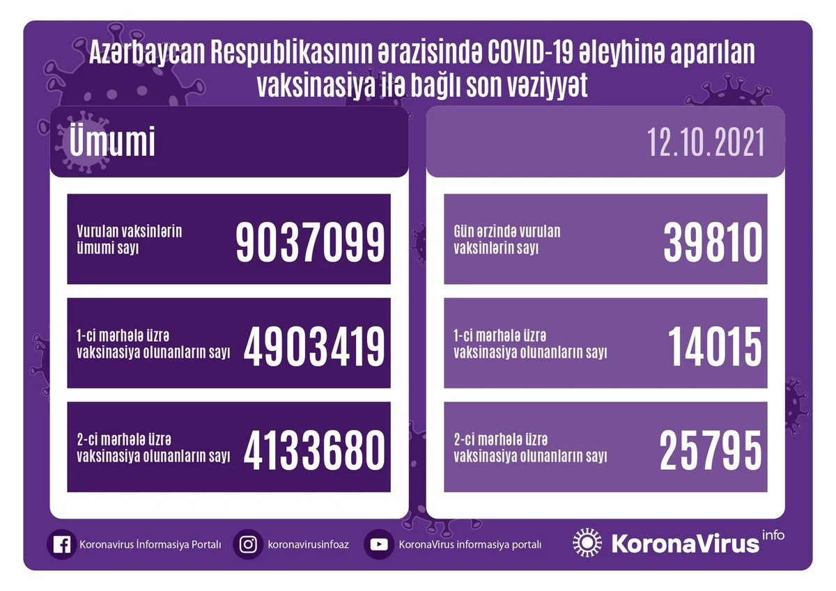 Ölkədə vurulan vaksinlərin ümumi sayı 9 037 099, birinci mərhələ üzrə vaksinasiya olunanların ümumi sayı 4 903 419, ikinci mərhələ üzrə vaksinasiya olunanların sayı isə 4 133 680 təşkil edir.