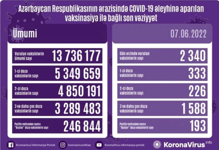 Azərbaycanda bu günə qədər vurulan vaksinlərin ümumi sayı 13 736 177, birinci doza peyvəndlərin ümumi sayı 5 349 659, ikinci doza vaksinlərin sayı 4 850 191 təşkil edib. Üç və daha çox doza vaksinlərin sayı 3 289 483, pozitiv nəticədən sonra buster doza vaksinlərin sayı isə 246 844 olub.
