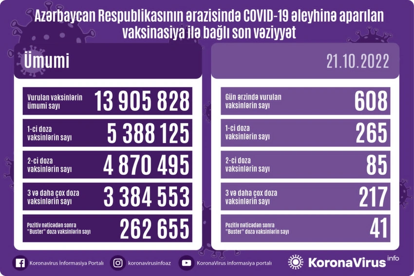 Qeyd edək ki, ölkədə indiyədək vurulan vaksinlərin ümumi sayı 13 905 828 təşkil edir.