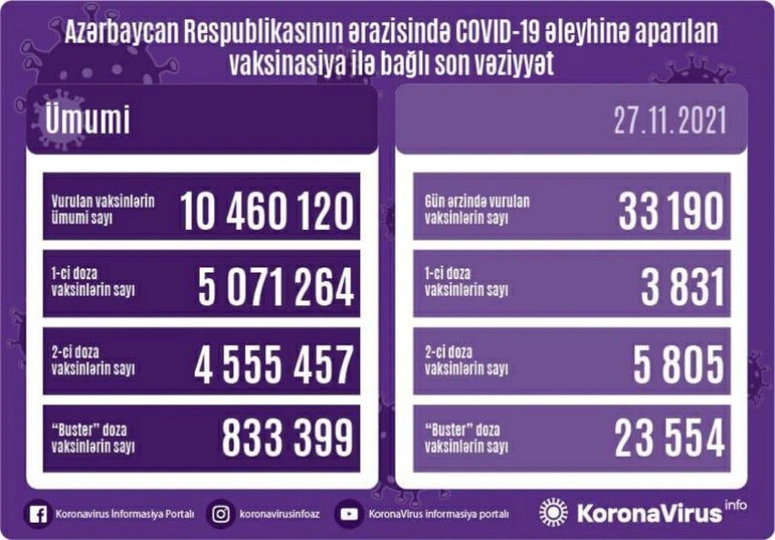 Azərbaycanda bu günə qədər vurulan vaksinlərin ümumi sayı 10 460 120, birinci mərhələ üzrə peyvənd olunanların ümumi sayı 5 071 264, ikinci mərhələ üzrə vaksinasiya edilənlərin sayı 4 555 457 nəfər təşkil edir.
