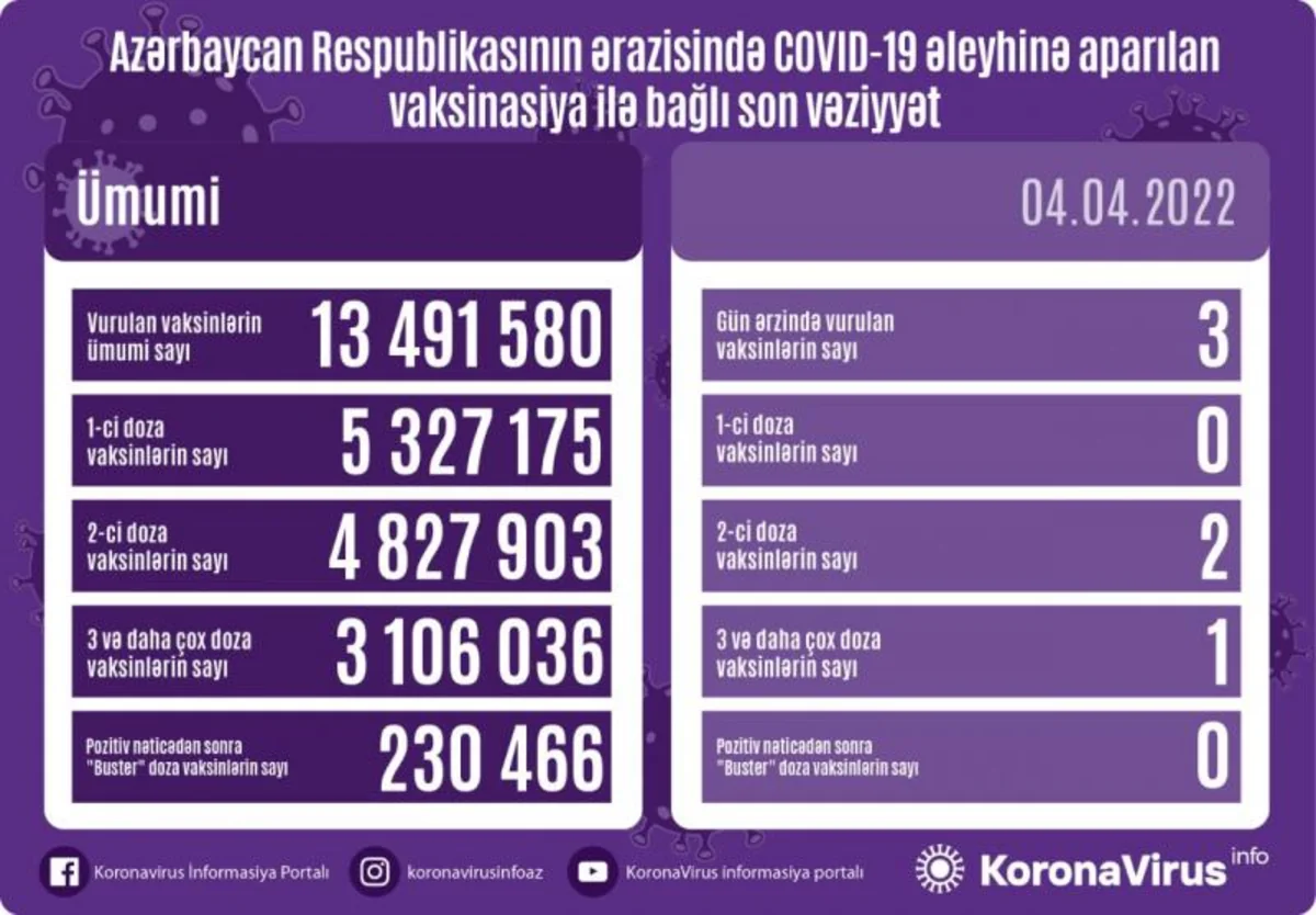 Üç və daha çox doza vaksinlərin sayı 3 106 036, pozitiv nəticədən sonra “buster” doza vaksinlərin sayı isə 230 466 olub.