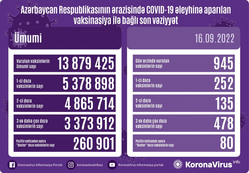Qeyd edək ki, ölkədə indiyədək vurulan vaksinlərin ümumi sayı 13 879 425 təşkil edir.