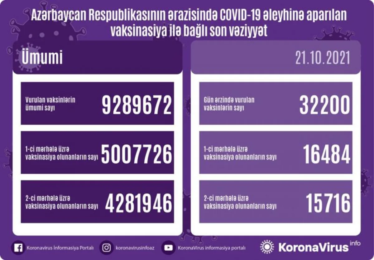 Ölkədə vurulan vaksinlərin ümumi sayı 9 289 672, birinci mərhələ üzrə vaksinasiya olunanların ümumi sayı 5 007 726, ikinci mərhələ üzrə vaksinasiya olunanların sayı isə 4 281 946 təşkil edir.