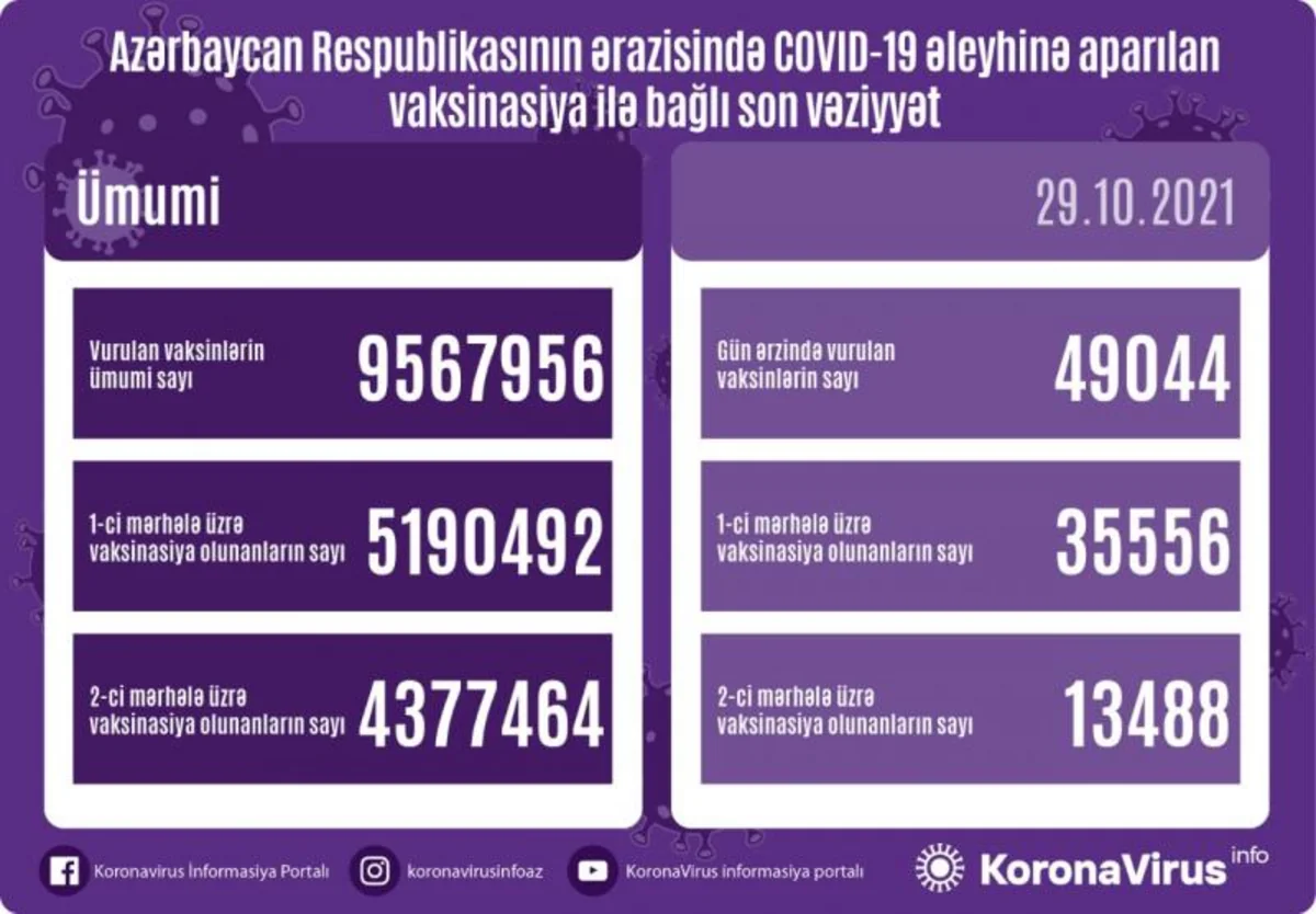 Azərbaycanda son sutkada koronavirus (COVID-19) əleyhinə 49 044 vaksin vurulub.