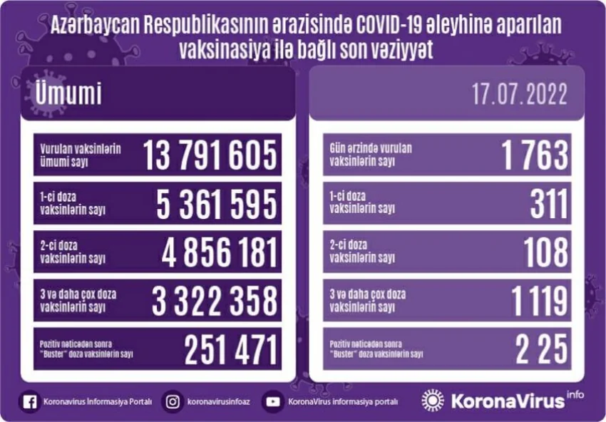 Azərbaycanda bu günə qədər vurulan vaksinlərin ümumi sayı 13 791 605, birinci doza peyvəndlərin ümumi sayı 5 361 595, ikinci doza vaksinlərin sayı 4 856 181 təşkil edib. Üç və daha çox doza vaksinlərin sayı 3 322 358, pozitiv nəticədən sonra “buster” doza vaksinlərin sayı isə 251 471 olub.