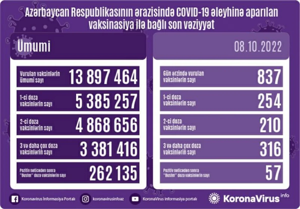 Azərbaycanda bu günə qədər vurulan vaksinlərin ümumi sayı 13 897 464 olub.