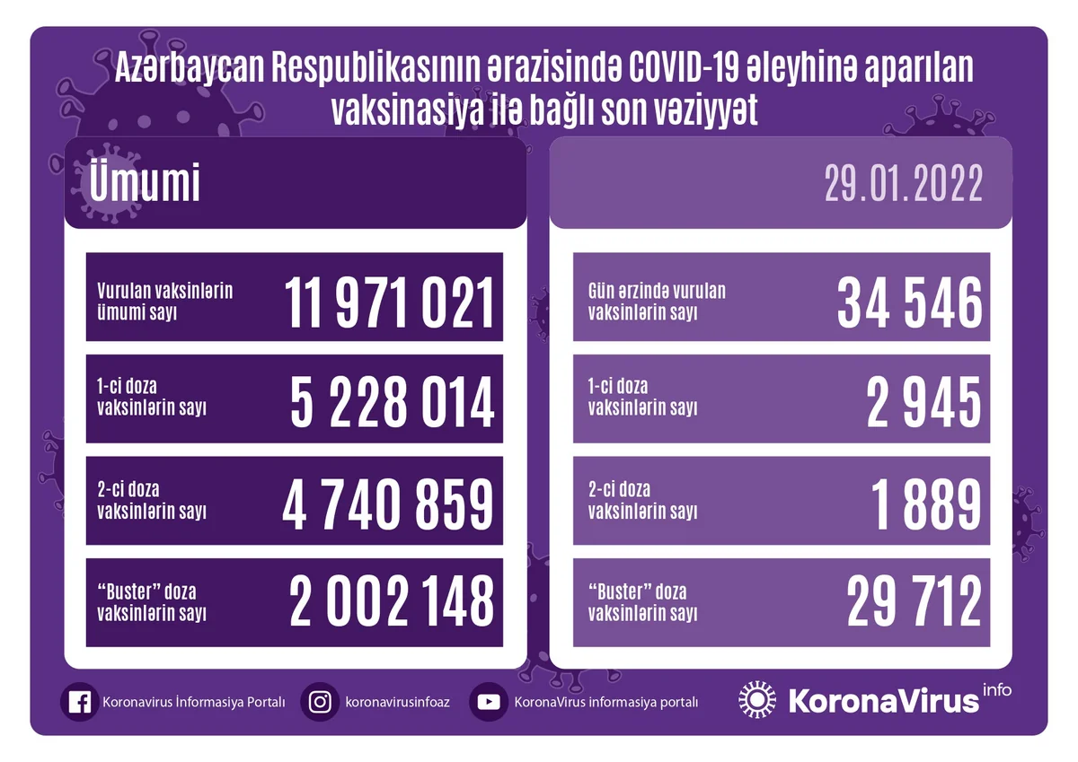 Ölkədə vurulan vaksinlərin ümumi sayı 11 971 021, birinci mərhələ üzrə vaksinasiya olunanların ümumi sayı 5 228 014, ikinci mərhələ üzrə vaksinasiya olunanların sayı 4 740 859, buster doza üzrə vaksinasiya olunanların sayı isə 2 002 148 təşkil edir.