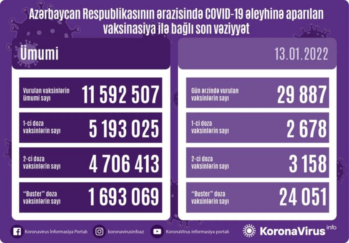 Birinci mərhələ üzrə vaksinasiya olunanların sayı 2 678, ikinci mərhələ üzrə vaksinasiya olunanların sayı 3 158, buster doza üzrə vaksinasiya olunanların sayı isə 24 051 nəfərdir.