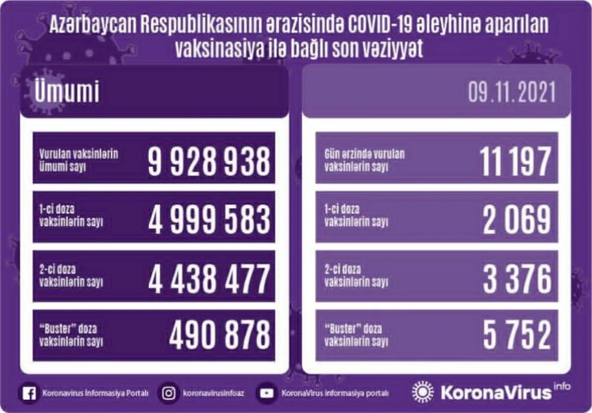 Ölkədə vurulan vaksinlərin ümumi sayı 9 928 938, birinci mərhələ üzrə vaksinasiya olunanların ümumi sayı 4 999 583, ikinci mərhələ üzrə vaksinasiya olunanların sayı 4 438 447, "buster" doza üzrə vaksinasiya olunanların sayı isə 490 878 təşkil edir.