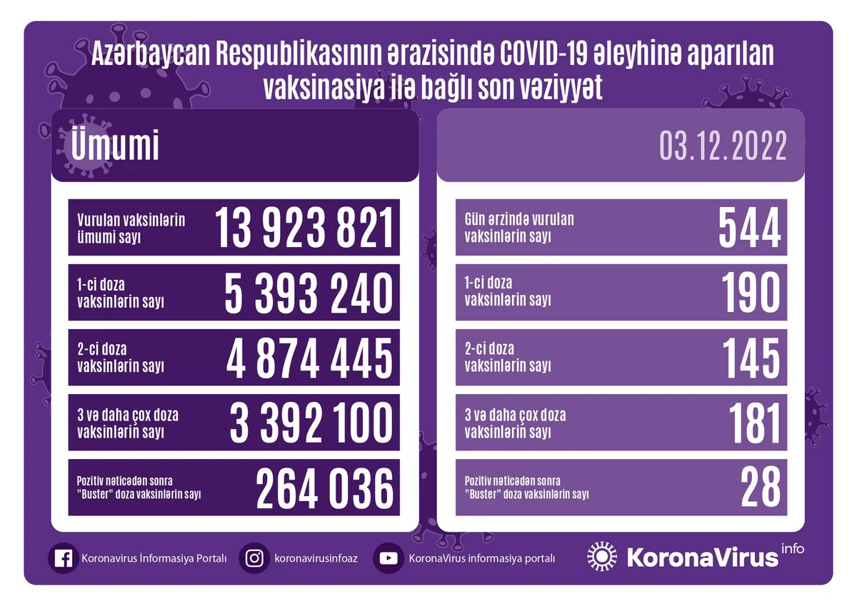 Azərbaycanda bu günə qədər vurulan vaksinlərin ümumi sayı 13 923 821 olub.